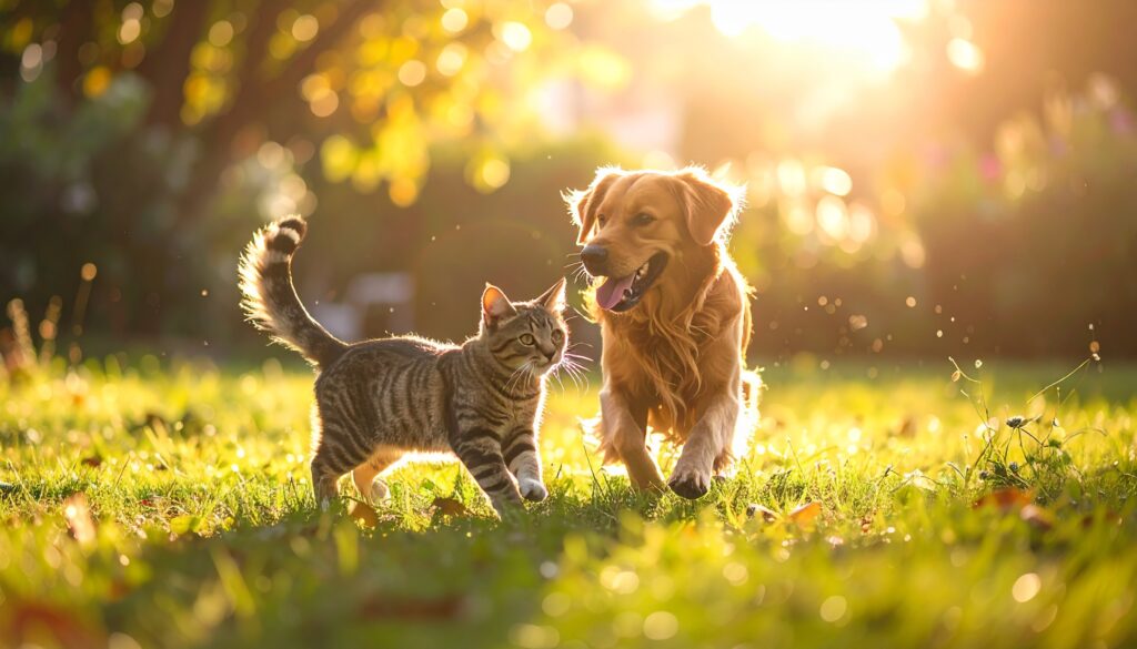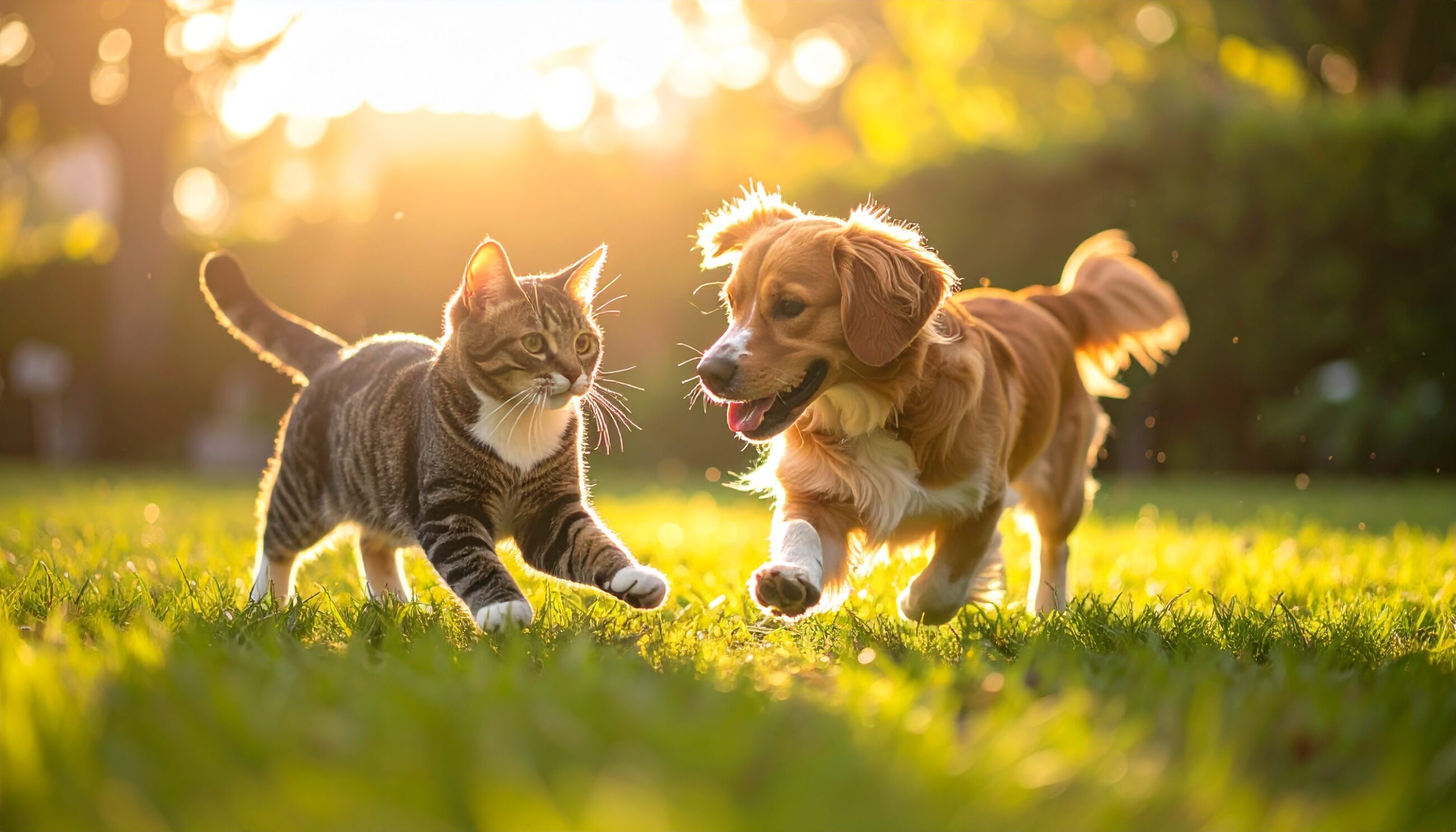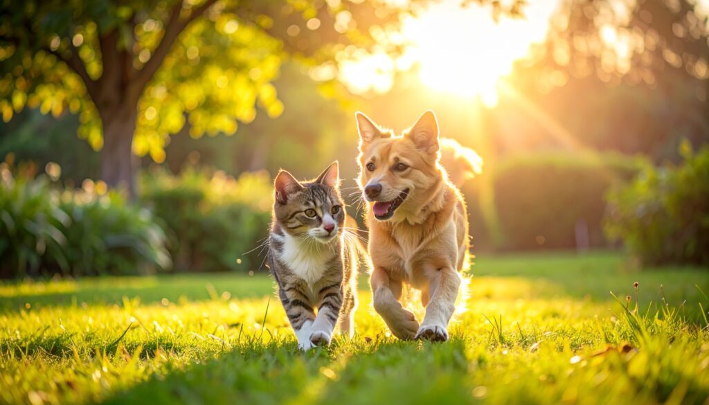 夕暮れの柔らかな光に包まれた公園で、犬と猫が肩を並べて楽しそうに駆け出す一瞬。緑の芝生と木々が背景となり、種族を越えた自然な絆と穏やかな時間の流れを感じさせる、心温まるシーンです。
