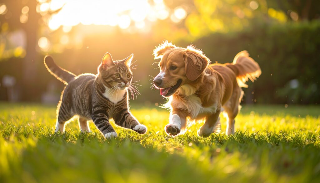 夕日に照らされた芝生の上を、猫と犬が並んで駆け抜ける微笑ましい瞬間。お互いを気にかけるような視線と軽やかな足取りから、種族の違いを越えた信頼と楽しさが伝わってきます。穏やかな光と自然に包まれた、心が和むワンシーンです。