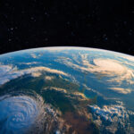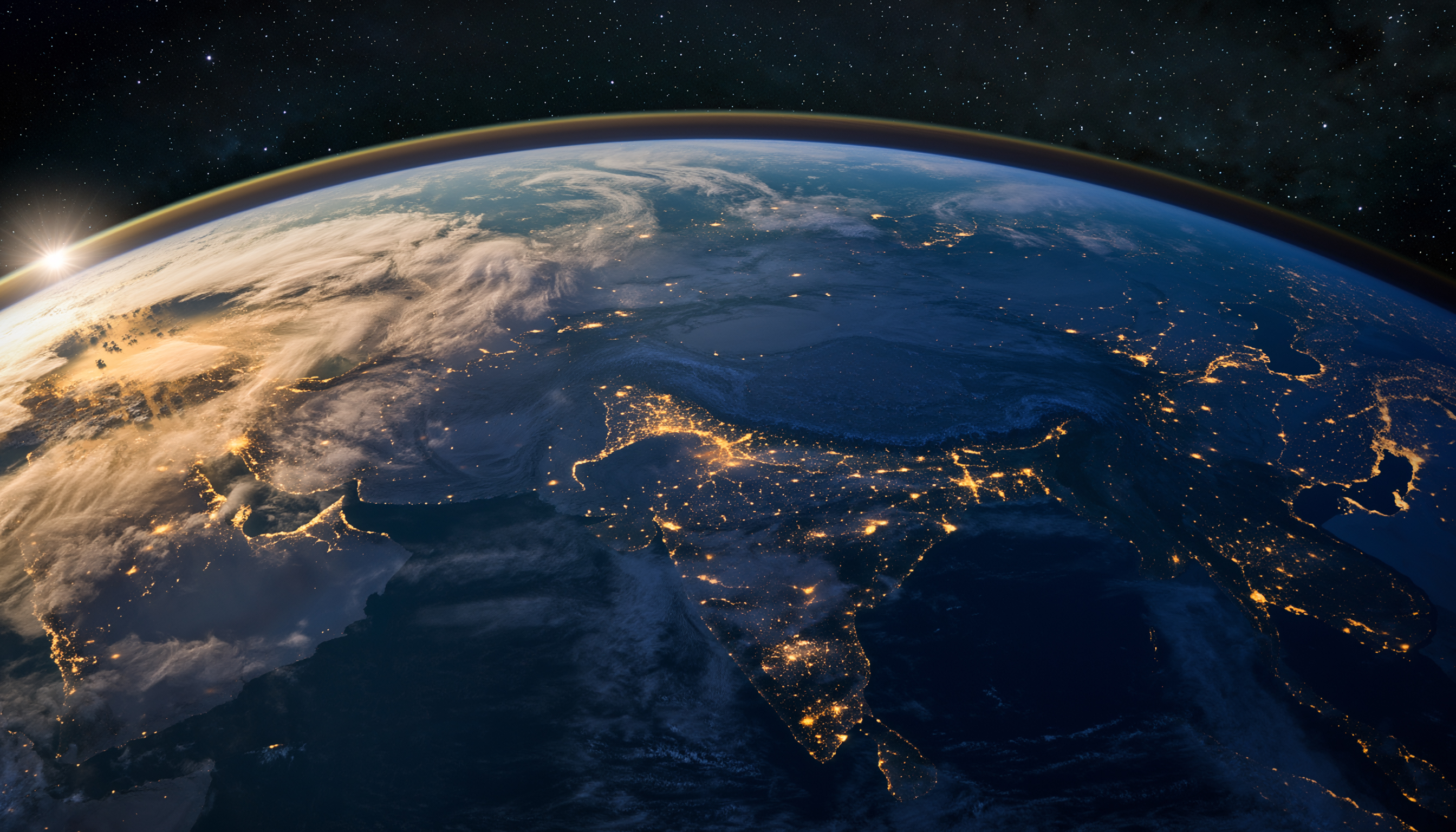 宇宙から見下ろした地球の夜明けの瞬間。地平線から昇る光が大気を照らし、都市の灯りが星座のように大陸を浮かび上がらせています。雲の流れと人類の営みが同時に感じられ、地球規模のつながりと生命の息吹を印象的に伝える一枚です。