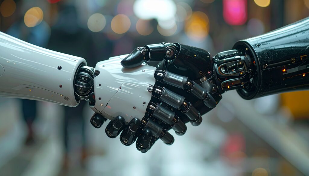 近未来的な街の風景を背景に、人型ロボット同士がしっかりと握手を交わす瞬間。精巧に作られた機械の手は、人の動きを思わせる自然さを備え、テクノロジーの進化と信頼の象徴を感じさせる。人とAIが共存する未来社会の可能性をイメージさせる印象的な一枚。