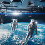 人型ロボット同士が握手している画像から動画生成しました。AIとテクノロジーが連携する未来社会をイメージさせるシーン。