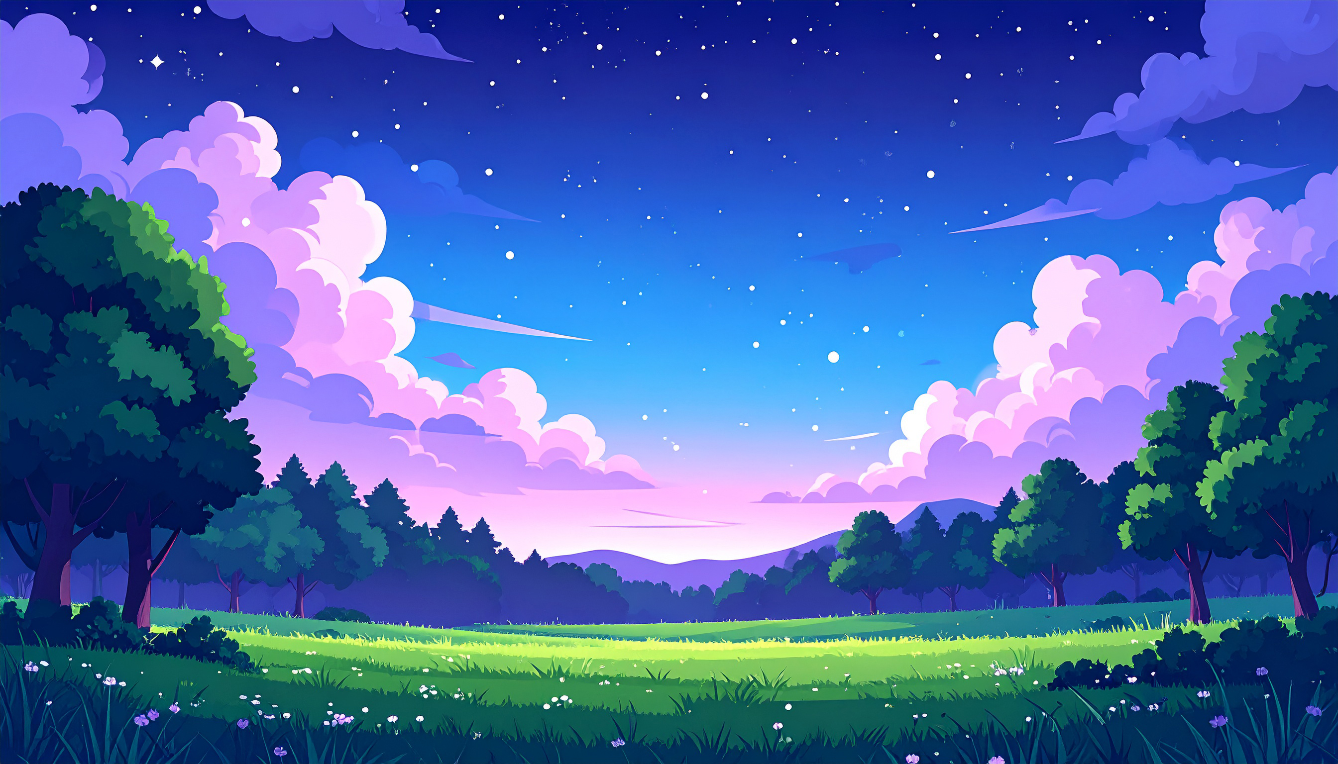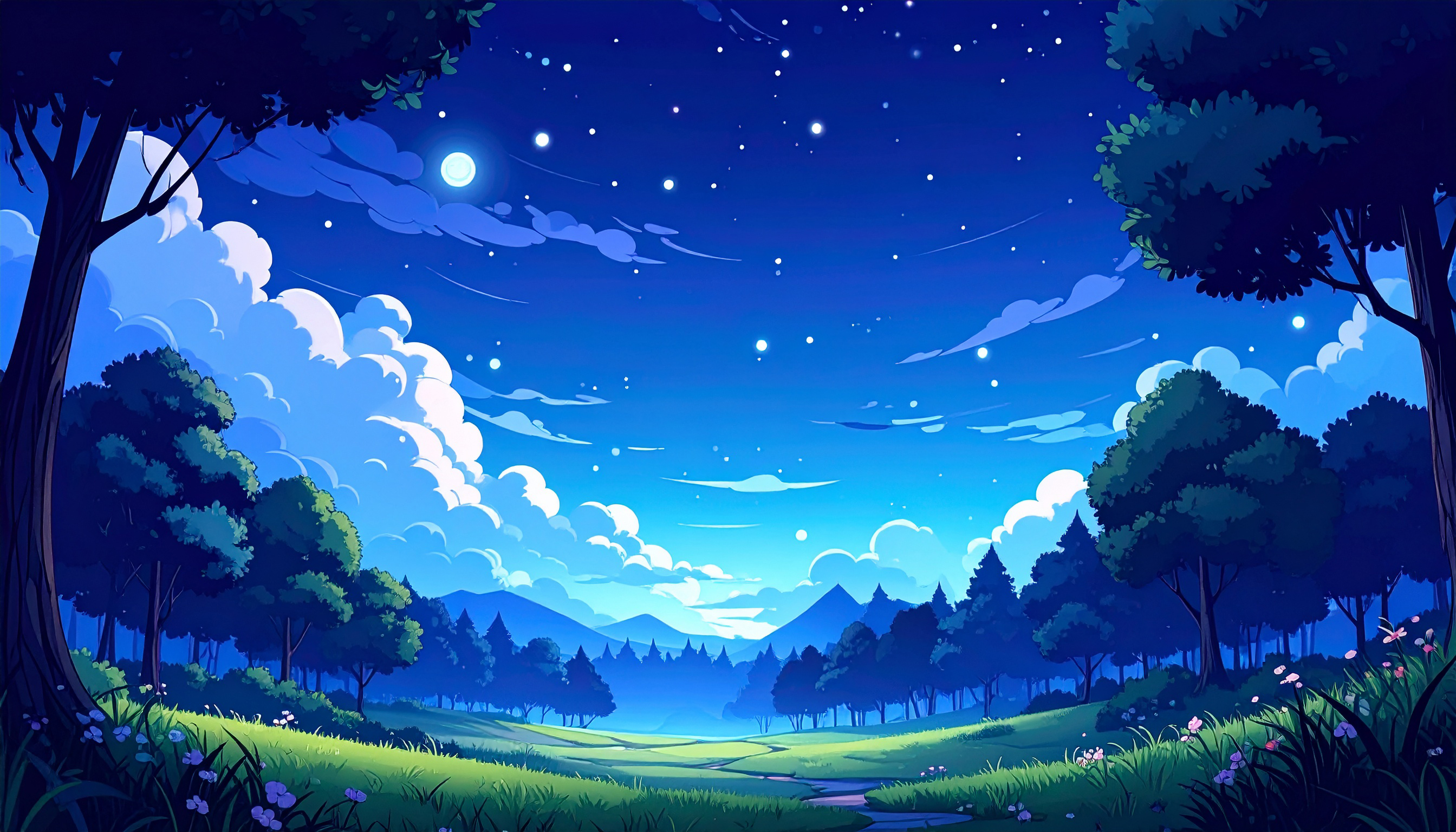 深い青に染まる夜空一面に、無数の星と淡く輝く天の川が広がる幻想的な風景。流れる雲の隙間から星々が瞬き、遠くには穏やかな山並みと森のシルエットが静かに連なっている。自然の息遣いと宇宙の広がりを同時に感じさせる、心を落ち着かせる夜の情景。